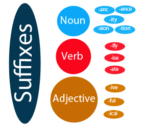 We can go further and say there are noun suffixes, verb suffixes and adjective suffixes. Some examples of noun suffixes are ‘-acy’ (which means state or quality), ‘-ism’ ( belief or system), ‘ment’ (condition), etc. Think of the words ‘democracy’, ‘Judaism’ and ‘contentment’. Respectively, they mean the concept of being democratic or an instance of this; the Jewish faith; and a person’s content state of mind.